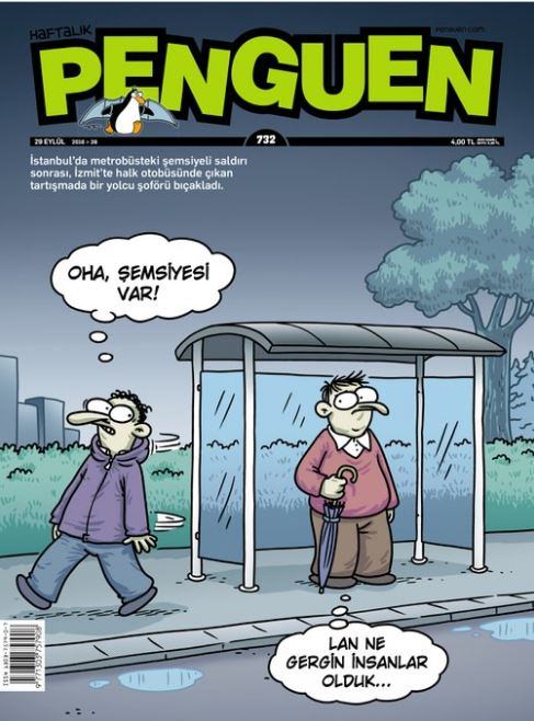 Haftalık mizah dergisi Penguen, İstanbul’da metrobüs şoförüne bir yolcunun şemsiyesiyle saldırmasını kapağına aldı.