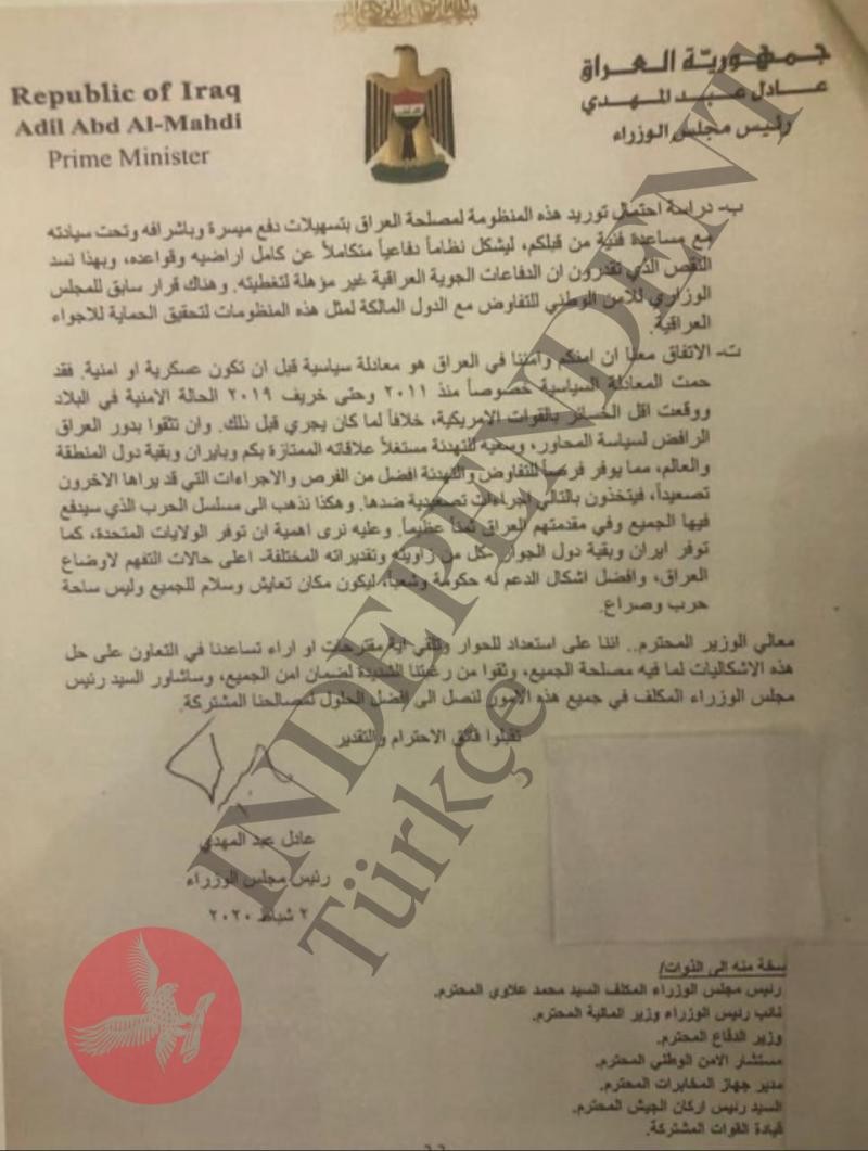 Mektupta Abdulmehdi, Patriot sisteminin kurulması talebini incelediklerini, bu konuda ABD tarafı ile ortak toplantı gerçekleştirdiklerini yazdı.