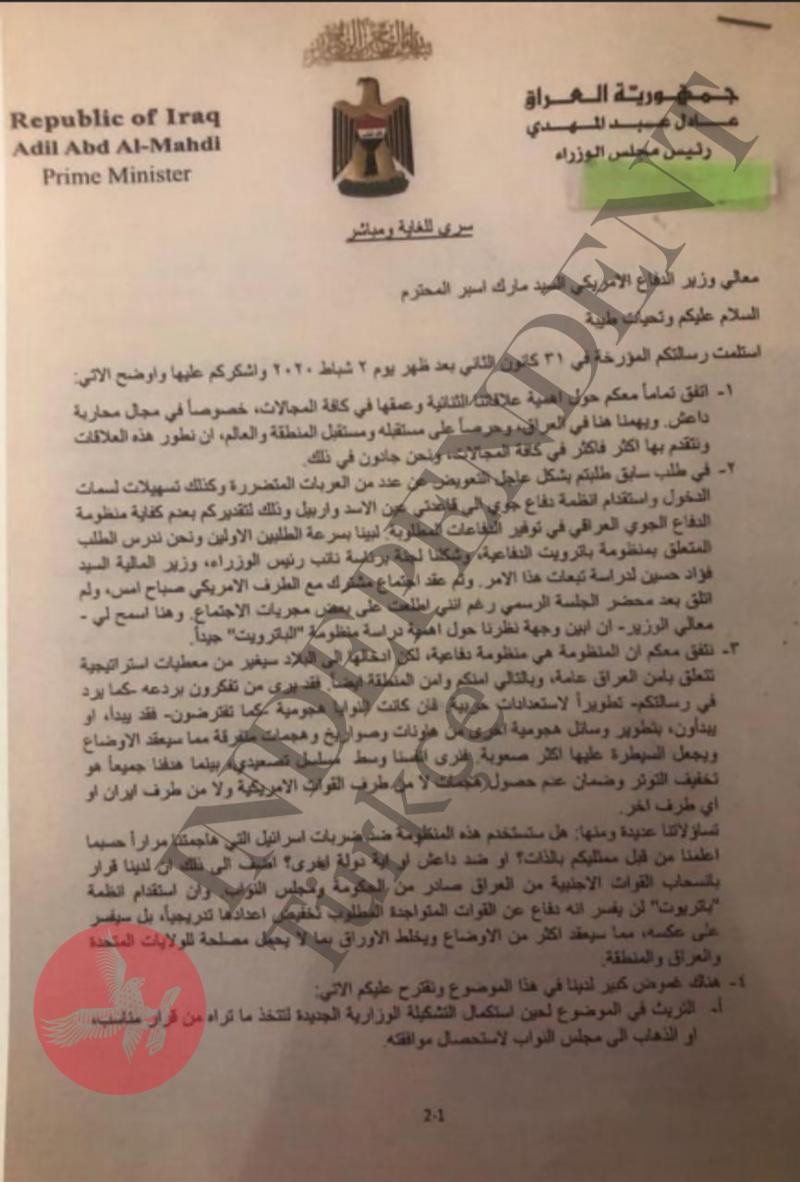 Savunma Bakanı Esper’in eski Irak Başbakanı Abdulmehdi’ye gönderdiği mektup ortaya çıktı. Mektupta Irak'a 'Patriot Savunma Sistemi' kurulması yönünde talepte bulunuluyor.