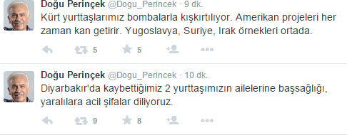 Vatan Partisi Genel Başkanı Doğu Perinçek, Diyarbakır'daki HDP mitingine yapılan bombalı saldırıya ilişkin sosyal medya hesabından açıklama yaptı. Dünkü saldırı sonrasında hayatını kaybedenlerin ailelerine başsağlığı, yaralılara da şifa dileyen Doğu Perinçek, "Kürt yurttaşlarımız bombalarla kışkırtılıyor. Amerikan projeleri her zaman kan getirir. Yugoslavya, Suriye, Irak örnekleri ortada" şeklinde mesaj yazdı.