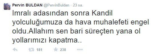 Pervin Buldan resmi Twitter hesabından olayı şöyle duyurdu: "İmralı adasından sonra Kandil yolculuğumuza da hava muhalefeti engel oldu. Allah’ım sen bari süreçten yana ol yollarımızı kapatma.."