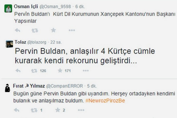 Diyarbakır'daki Nevruz kutlamalarında Pervin Buldan Öcalan'ın mesajını Kürtçe okudu. Ancak meydanı dolduran yüz binlerce Kürt, Buldan'ın Kürtçe'sinden hiçbir şey anlamadı. Sırrı Süreyya Önder Türkçe okuyunca mesaj anlaşıldı. Pervin Buldan'ın Öcalan'ın mektubunu Kürtçe okumasının ardından, sosyal medyada Buldan'ın Kürtçe'si alay konusu oldu.