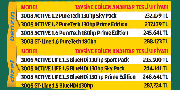 Peugeot’un yeni nesil I-cockpit’i üzerinde, direksiyonda formula vites diye tabir edilen kulakçıklar var. Direksiyondaki tuş sayesinde kişiye özel kadran ayarlama seçeneği de mevcut. 8 inçlik dev ekrana sahip dokunmatik yol bilgisayarı kişiselleştirilebilir ekranı ile göz hizasında konumlandırılmış. Telefonlarla uyumlu çalışabilmesinin yanı sıra kompakt direksiyondan da ekrana müdahale edilebiliyor. Hemen altında uçak kokpitinden esinlenen iç tasarımı ile araç özelliklerini kullanmanızı sağlayan ve piyano tuşlarını anımsatan 7 adet tuş yer alıyor. Ek olarak sport modu, elektrikli el freni ve derinlemesine kolçak bulunuyor. Bu arada aracın sıfırdan 100’e çıkma saniyesi 8.0, yakıt tüketimi ise 4.0 litre / 100 kilometre.