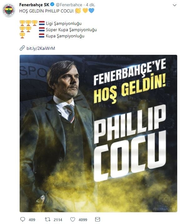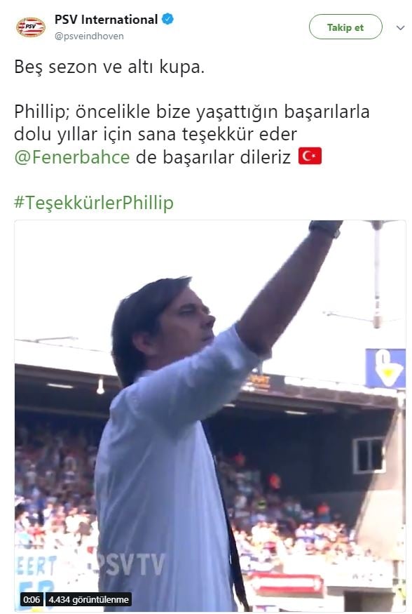 Hollandalı teknik adamın 5 sezondur görev yaptığı PSV Eindhoven kulübü, resmi Twitter hesabından yaptığı Türkçe açıklamada, Cocu'nun Fenerbahçe'yle anlaştığını duyururken, 47 yaşındaki teknik adama başarılar diledi.