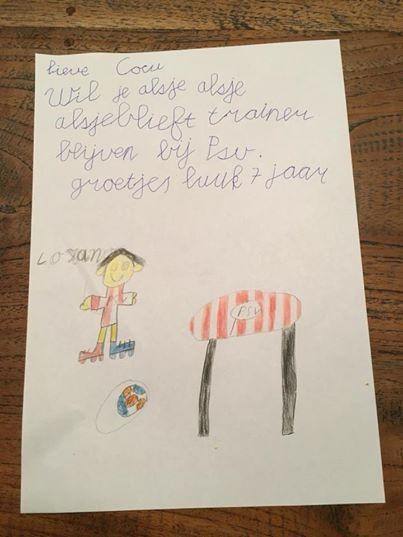 Fenerbahçe'nin yeni teknik direktörü olması beklenen Cocu'nun PSV'de kalması için büyük baskı var. Bunlardan biri 7 yaşındaki Luuk'tan. 7 yaşındaki Luuk, annesi Yvonne Oversteeg-Janssen aracılığıyla Cocu'ya verilmek üzere bir mektubu PSV Eindhoven kulübüne gönderdi.