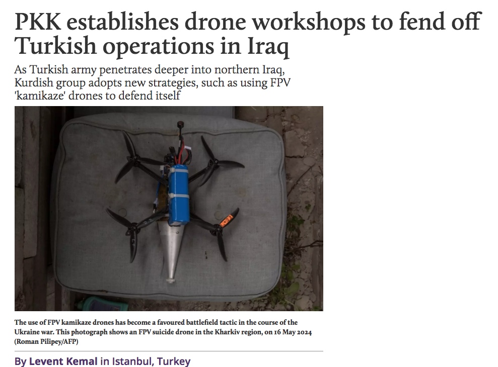 Konuyu bilen kaynaklar Middle East Eye (MEE) sitesine, PKK’nın Suriye üzerinden kurduğu uluslararası bağlantıları ve finansman ağlarını kullanarak Kuzey Irak’ta Süleymaniye ve Kandil arasındaki çeşitli bölgelerde FPV drone üretim atölyeleri kurduğunu söyledi. Kaynaklar MEE’ye, PKK’nın Ukrayna ve Avrupa drone pazarlarının yanı sıra Gürcistan ve İran üzerinden de malzeme tedarik zinciri kurduğunu söyledi.