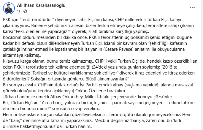 Yeni Akit Gazetesi yazarı Ali İhsan Karahasanoğlu, silah bırakma karşıtlığı yapan CHP milletvekili Türkan Elçi'yi adeta yerin dibine soktu.