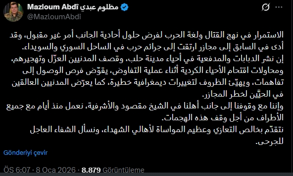 Saha kaynakları, Mazlum Abdi’nin bu açıklamalarının örgüt içindeki büyük paniğin dışa vurumu olduğunu belirtiyor. 10 Mart mutabakatına uymayarak Suriye devletini oyalama taktiği güden teröristlerin, bugün Eşrefiye’de teslim olmak zorunda kalması, bölgedeki PKK-SDG varlığının sonuna gelindiğinin en açık göstergesi oldu.
