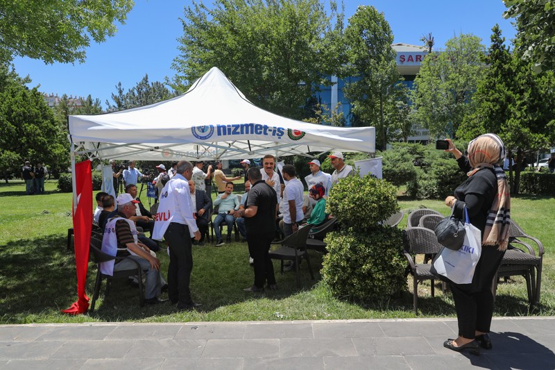 Hizmet-İş Genel Sekreter Yardımcısı Zekeriya Koca, Hizmet-İş Diyarbakır Şube Başkanı Ercan Kahraman, sendika üyeleri ve bazı belediyelerde işten çıkarılan işçiler, merkez Bağlar Belediyesi karşısında çadır kurdu.