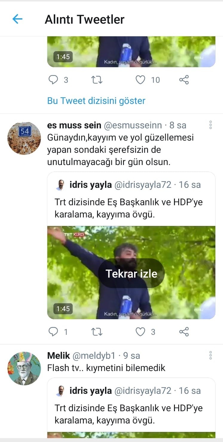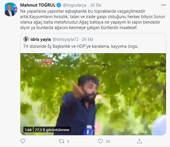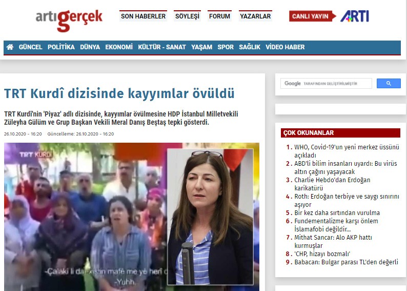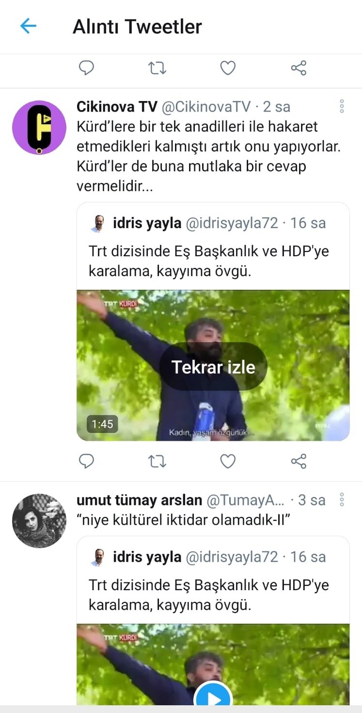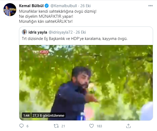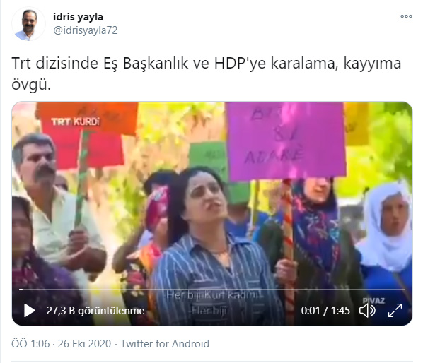 PKK'ya yakınlığı ile bilinen Jiyan Haber isimli internet sitesi yazarlarından İdris Yayla, TRT Kurdi kanalında yayımlanan Piyaz (Soğan) isimli Kürtçe skeç programından bir kesit alıntılayarak “TRT dizisinde eş başkanlık ve HDP'ye karalama, kayyıma övgü” ifadelerinin yer aldığı Twitter paylaşımında bulundu.
