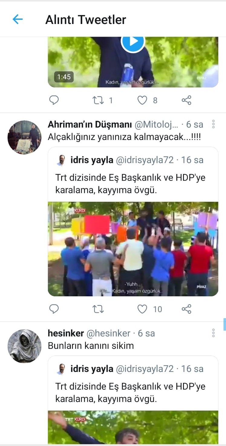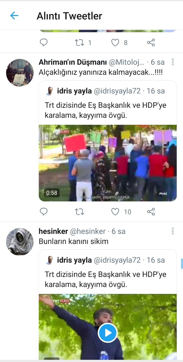 HDP Grup Başkan Vekilleri ile HDP Siirt, Diyarbakır, Gaziantep, İstanbul ve Antalya milletvekillerinin Twitter'da TRT Kurdi'ye yönelik başlattıkları linç girişiminde PKK sempatizanlarından hem kanala hem de skeçte oynayan oyunculara karşı küfür ve tehdit paylaşımları geldi.
