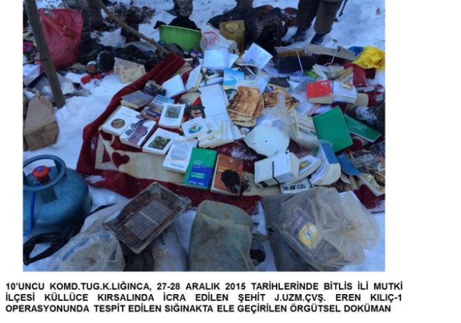 Bitlis'in Mutki ilçesi kırsalında terör örgütü PKK'nın sığınağına baskın düzenlendi. Operasyonda çok sayıda patlayıcı yapımında kullanılan malzeme ele geçirilirken bir de Kürtçe İncil bulundu. Güvenlik birimlerinden alınan bilgiye göre, 10'uncu Komando Tugay Komutanlığı tarafından şehit Jandarma Uzman Çavuç Eren Kılıç-1 Operasyonu kapsamında, 27 Aralık 2015 tarihinde Bitlis'in Mutki ilçesi kırsalında yapılan arazi aramasında tespit edilen sığınakta, terör örgütüne ait el yapımı patlayıcı yapımında kullanılmak üzere çok sayıda malzeme, çeşitli yaşam malzemeleri, bir Kürtçe İncil ve çok sayıda örgütsel döküman ele geçirildi.