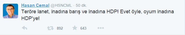 PKK yanılsı yazıları ile de tanınan Cemal, sosyal medyadan yaptığı açıklamada, "Teröre laneti inadına barış ve inadına HDP! Evet öyle, oyum inadına HDP'ye!" ifadelerini kullandı.
