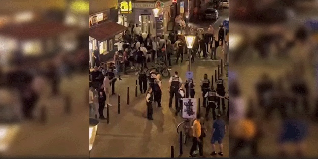 Kameraya yansıyan anlarda, gurbetçilerden biri ise PKK'lı grubun olduğu alana doğru ilerledi. Bozkurt işareti yapan Türk, "Ya Allah bismillah, Allahu Ekber" diye bağırdı. Alman polisi, bir anda araya girerek şahsı uzaklaştırdı.