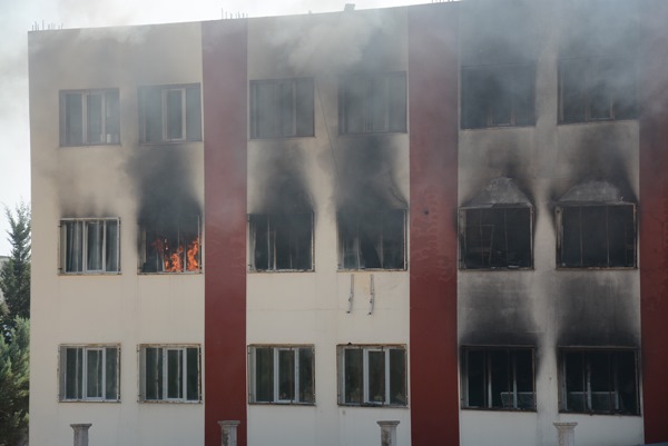 Nusaybin ilçesinde IŞİD bahanesiyle düzenlenen izinsiz gösterilerde molotofkokteyli ve havaifişek atılarak yakılan özel bir öğrenci yurdu yeniden ateşe verildi.