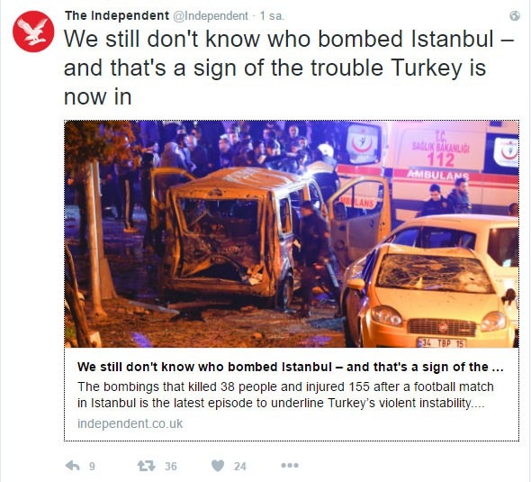 İngiliz İndependent gazetesi, geçtiğimiz gün İstanbul Beşiktaş'ta düzenlenen hain saldırının sorumlusunun henüz kimler olduğunu bilinmediğini söyledi.