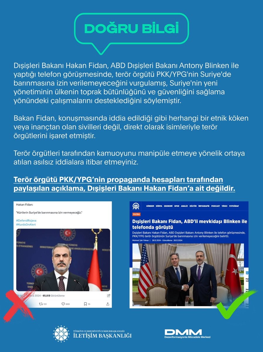 DMM'nin sosyal medya hesabı üzerinden yapılan açıklamada, "Terör örgütü PKK/YPG’nin propaganda hesapları tarafından paylaşılan açıklama, Dışişleri Bakanı Hakan Fidan’a ait değildir. Dışişleri Bakanı Hakan Fidan, ABD Dışişleri Bakanı Antony Blinken ile yaptığı telefon görüşmesinde, terör örgütü PKK/YPG'nin Suriye'de barınmasına izin verilemeyeceğini vurgulamış, Suriye'nin yeni yönetiminin ülkenin toprak bütünlüğünü ve güvenliğini sağlama yönündeki çalışmalarını desteklediğini söylemiştir. Bakan Fidan, konuşmasında iddia edildiği gibi herhangi bir etnik köken veya inançtan olan sivilleri değil, direkt olarak isimleriyle terör örgütlerini işaret etmiştir. Terör örgütleri tarafından kamuoyunu manipüle etmeye yönelik ortaya atılan asılsız iddialara itibar etmeyiniz" ifadelerine yer verildi.