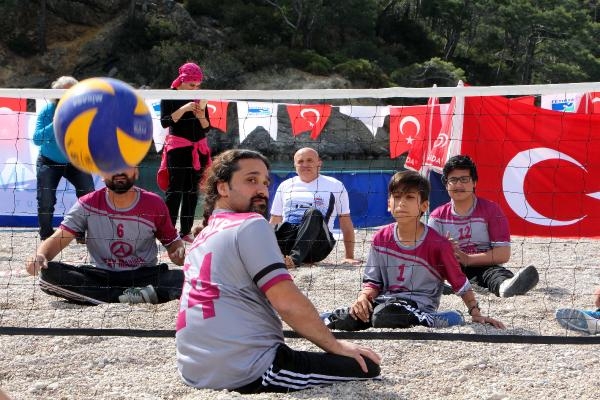 Muğla'nın Fethiye İlçesi'ndeki dünyaca ünlü Ölüdeniz'deki Kumburnu Plajı'na gelerek protez bacak, koltuk değneği ve tekerlekli sandalyelerini saha kenarında bırakan engelli sporcular, oturarak plaj voleybolu oynadı.