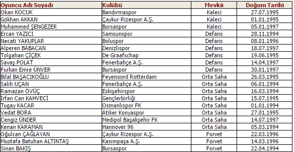 Ümit Milli Takım'ın aday kadrosunun son hali şöyle:;