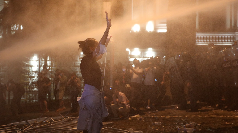 Gürcistan'ın başkenti Tiflis'te Parlamento binası önünde toplanan göstericiler, iktidardaki Gürcü Hayali Partisi'nin milletvekillerinin çıkış yollarını kapatmak amacıyla binayı ablukaya almak istedi.