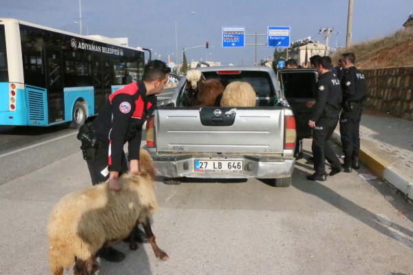 Adıyaman'da, sürücüsünün kaçmaya çalıştığı kamyonet, yolu kesen polis ekipleri tarafından durduruldu. Bu sırada kamyonetin kasasından atlayıp yola çıkan koyunlar, polis tarafından yakalanırken, muayene tarihi geçtiği için kaçtığı belirlenen sürücüye ceza yazıldı.