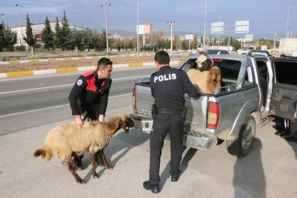 Bu sırada kamyonetin kasasında bulunan 2 koyun atlayarak yola çıktı. Polislerin ve araçtakilerin çabasıyla güçlükle yakalanan hayvanlar tekrar kamyonete bindirildi.