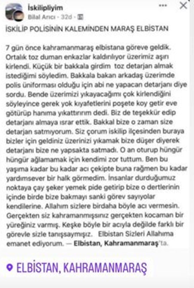 Biz de polis yeleklerimizi ve kıyafetlerimizi yıkacağımızı söyledik. O da 'Ben size deterjan satmam ama kıyafetlerinizi getirin evimde yıkattırırım' dedi. Daha sonra gözleri yaşardı. Evinin yıkıldığını belirtti. 'Siz, bizim için Çorum İskilip’ten gelmişsiniz, siz kirli elbiseyle gezeceksiniz biz de temiz elbise giymeye utanırız' dedi. 'Biz, kahraman Elbistanlıyız' dedi. Ben normalde neşeli bir insanımdır ama boğazım düğümlendi konuşamadım. Sarıldım orada hiçbir şey söylemeden çıktım. Bize deterjanı satmadı. Çok duygulandım bu durum karşısında. Kendi sosyal medya hesabımdan o paylaşımı yaptım. Sabah kalktığımda paylaşımın her yerde yayıldığını gördüm” ifadelerini kullandı.