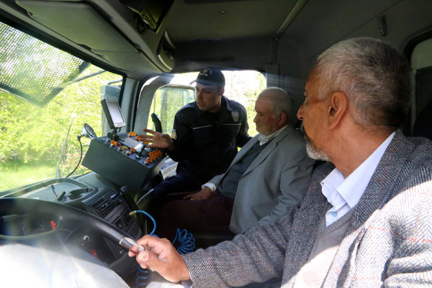 Daha sonra yaşlılara TOMA hakkında bilgi veren polisler, huzurevindeki 2 kişiyi araca bindirdi ve nasıl çalıştığını gösterdi.