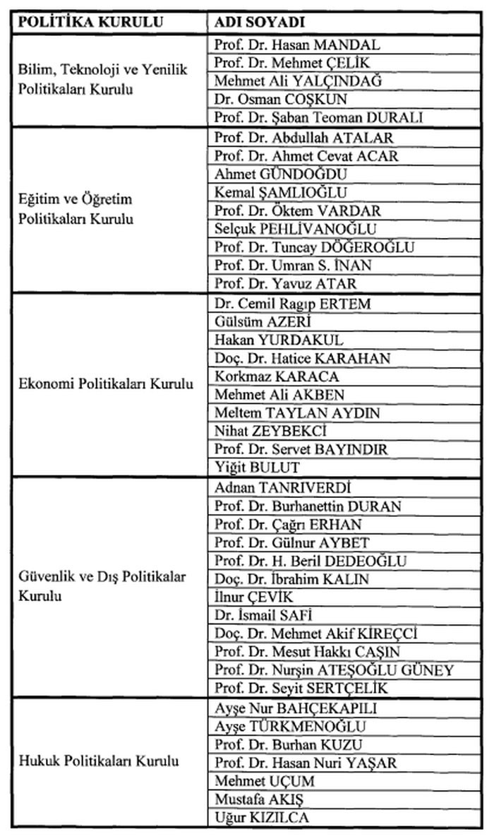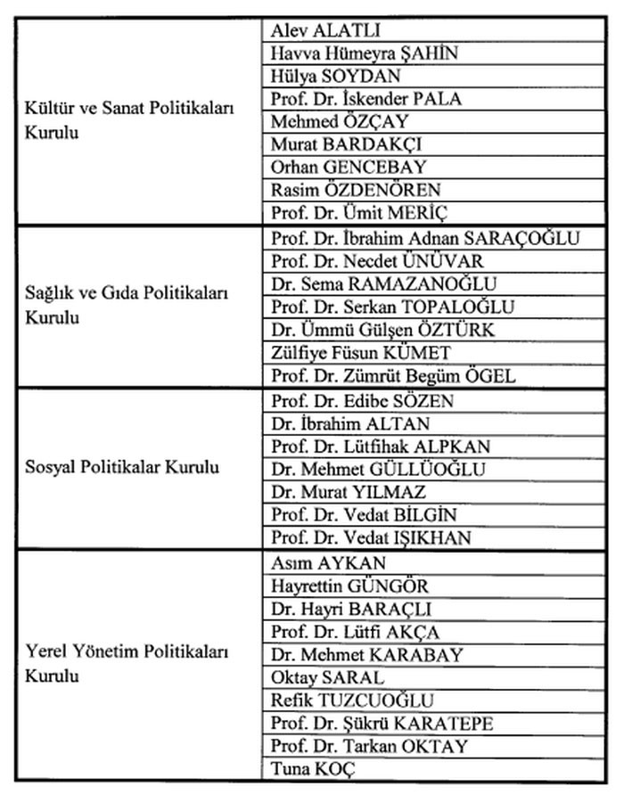 Politikalar Kuruluna atanan isimler şunlar olmuştu: