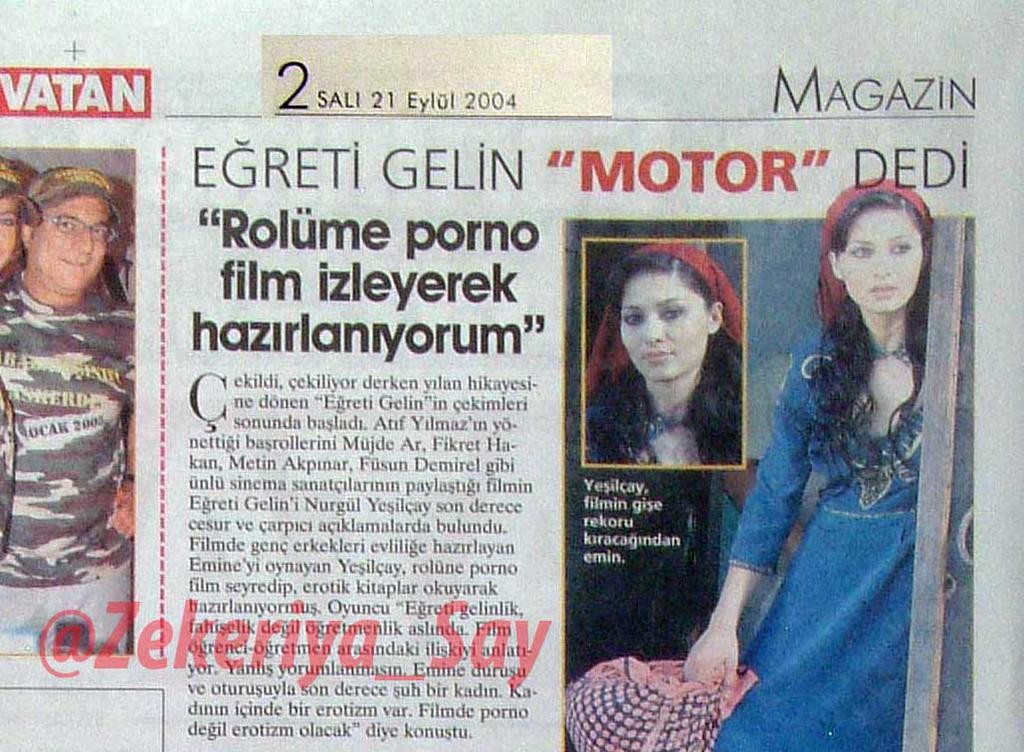 2013 yılında Hürriyet'ten Hakan Gence ile Mehmet Turgut'a konuşan ve Eğreti Gelin filmindeki rolü için porno izlediğini itiraf eden Nurgül Yeşilçay "Eğreti Gelin'de Atıf Yılmaz'a 'role nasıl hazırlanacağız' diye sordum. 'Git porno film izle' dedi. Zaten ineğimdir. Oturdum, bütün porno filmleri analizlerini çıkararak izledim, ödevimi yaptım." ifadelerine yer vermişti.