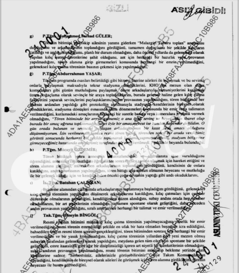 “Arkadaşlarımın taleplerini silsile yoluyla sıralı Tabur Komutanına ilettim. Tabur Komutanı tören yönergesinde yapılan değişikliğe istinaden talebi reddetti. Bu durumu devre arkadaşlarıma anlattım. Dekan hocam ile veda maksadıyla yaptığım görüşme esnasında’ bana Malazgirt taburunu kastederek ‘sizinkiler yemin töreni metini mi değiştirmek istiyor, bu durum nedir?’ ve “Tören ile ilgili bir aksaklık olur mu’ diye sordu. Ben de ‘Bize emredildiği şekilde emir ve talimatlar çıkılmayacağını, tören bir aksaklık olmayacağını söyledim."