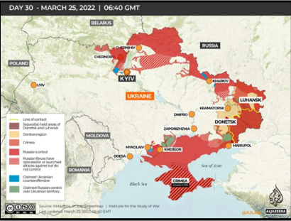 Rusya-Ukrayna işgalinin 25 Mart 2022 tarihli son durum haritası. Harita Al Jazeera tarafından yayınlanmıştır.