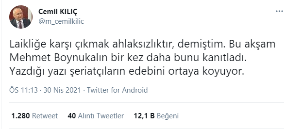 Kemalistlerin İlahiyatçısı Cemil Kılıç da ateist dernekleri ile aynı safta yer alarak, eski Ayasofya Camisi baş İmamı Prof. Dr. Mehmet Boynukalın'ı hedef aldı.