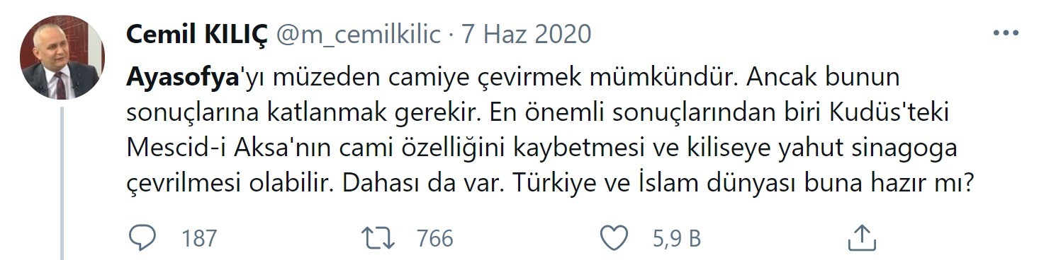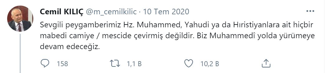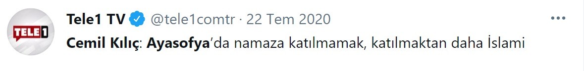 Aynı Cemil Kılıç, Ayasofya yeniden ibadete açıldıktan sonra ise şu değerlendirmeyi yapıyor: "Ayasofya'da namaza katılmamak, katılmaktan daha İslami."