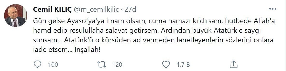 Ve günümüze gelindiğinde ise tüm ümitleri kaybeden Ayasofya düşmanı Cemil Kılıç, Ayasofya'da İmam olmak istediğini söylüyor: "Gün gelse Ayasofya'ya imam olsam, cuma namazı kıldırsam, hutbede Allah'a hamd edip resulullaha salavat getirsem. Ardından büyük Atatürk'e saygı sunsam... Atatürk'ü o kürsüden ad vermeden lanetleyenlerin sözlerini onlara iade etsem... İnşallah!"