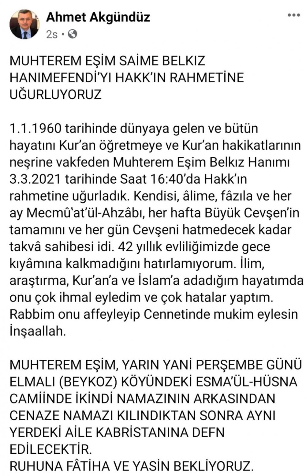 "Muhterem eşim Saime Belkız Hanımefendi'yi Hakk'ın rahmetine uğurluyoruz. 1. 1.1960 tarihinde dünyaya gelen ve bütün hayatını Kur’an öğretmeye ve Kur’an hakikatlarının neşrine vakfeden Muhterem Eşim Belkız Hanımı 3.3.2021 tarihinde Saat 16:40’da Hakk’ın rahmetine uğurladık. Kendisi, âlime, fâzıla ve her ay Mecmû‛at’ül-Ahzâbı, her hafta Büyük Cevşen’in tamamını ve her gün Cevşeni hatmedecek kadar takvâ sahibesi idi. 42 yıllık evliliğimizde gece kıyâmına kalkmadığını hatırlamıyorum. İlim, araştırma, Kur’an’a ve İslam’a adadığım hayatımda onu çok ihmal eyledim ve çok hatalar yaptım. Rabbim onu affeyleyip Cennetinde mukim eylesin İnşaallah.