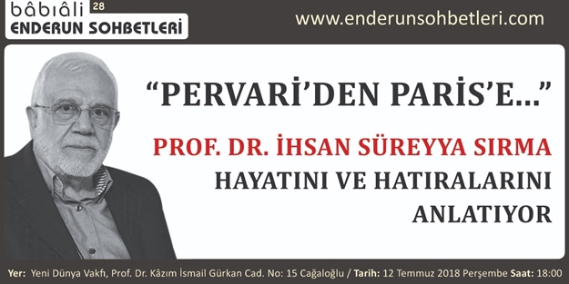 İlim dünyamızın mümtaz ismi, İslam tarihçisi ve Siirt İlahiyat Fakültesi Dekanı Prof. Dr. İhsan Süreyya Sırma, “Bâbıâli Enderun Sohbetleri”nde çocukluk yıllarından başlayarak hayatını anlatacak, ömrü boyunca unutamadığı hatıralarını dinleyicileriyle paylaşacak. Yeni Dünya Vakfı’nda 12 Temmuz Perşembe günü saat 18.00’de başlayacak olan programa İhsan Süreyya Sırma Kitabı Pervari’den Paris’e kitabını hazırlayan Prof. Dr. Adnan Demircan da katılacak ve programı yönetecek. Prof. Dr. İhsan Süreyya, katılımın serbest olduğu sohbet toplantısının ardından dinleyicilerin sorularına cevap verecek. Yazarın bütün eserleri, Beyan Yayınları tarafından neşrediliyor. Sohbet toplantısının yapılacağı Yeni Dünya Vakfı’nın adresi şöyle: Prof. Dr. Kâzım İsmail Gürkan Caddesi, No. 15 Cağaloğlu-İstanbul.