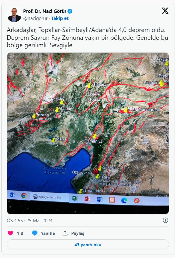 Adana'daki depreme ilişkin de paylaşım yapan Naci Görür, bölgenin gerilimli olduğuna dikkat çekerek, şunları paylaştı: