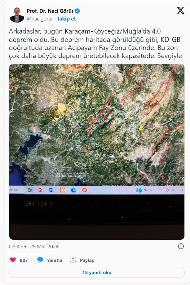 "Arkadaşlar, bugün Karaçam-Köyceğiz/Muğla’da 4,0 deprem oldu. Bu deprem haritada görüldüğü gibi, KD-GB doğrultuda uzanan Acıpayam Fay Zonu üzerinde. Bu zon çok daha büyük deprem üretebilecek kapasitede. Sevgiyle"