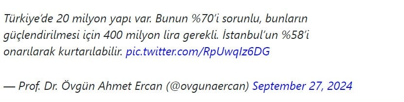 Ercan, “Türkiye’de 20 milyon yapı var. Bunun %70’i sorunlu, bunların güçlendirilmesi için 400 milyon lira gerekli. İstanbul’un %58’i onarılarak kurtarılabilir” mesajını paylaştı.