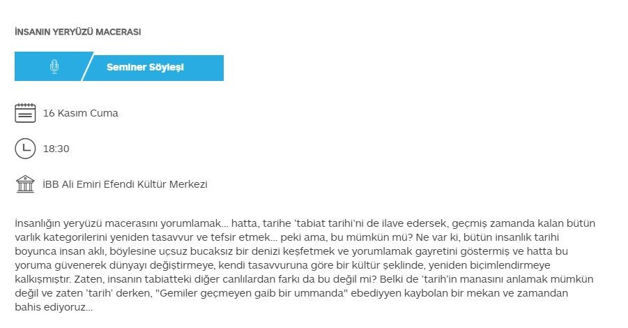 Tarih filozofu Prof. Dr. Şahin Uçar,  İBB Ali Emiri Efendi Kültür Merkezi'nde 'İnsanın Yeryüzü Macerası'  konulu bir seminer düzenleyecek. Uçar, 16 Kasım Cuma günü saat 18:30'da gerçekleştirilecek olan seminerde söyleşi yapacak.