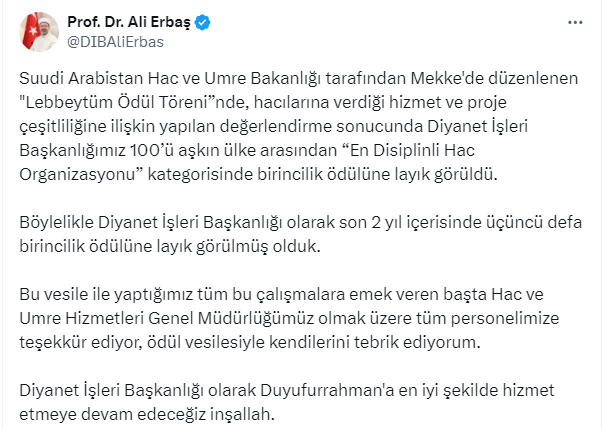 Prof. Erbaş, sosyal medya hesabından paylaştığı mesajında, "Suudi Arabistan Hac ve Umre Bakanlığı tarafından Mekke'de düzenlenen "Lebbeytüm Ödül Töreni”nde, hacılarına verdiği hizmet ve proje çeşitliliğine ilişkin yapılan değerlendirme sonucunda Diyanet İşleri Başkanlığımız 100’ü aşkın ülke arasından “En Disiplinli Hac Organizasyonu” kategorisinde birincilik ödülüne layık görüldü." dedi.