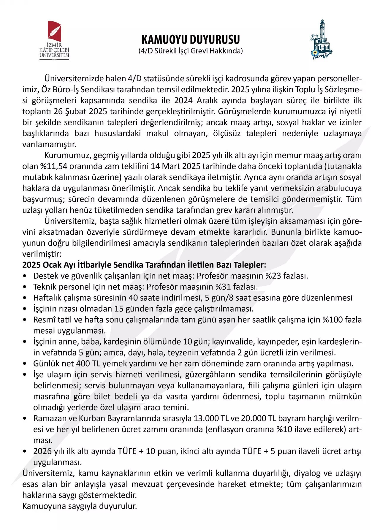 İKÇÜ Rektörlüğü tarafından yapılan kamuoyu duyurusuna göre, 2025 yılı TİS görüşmeleri kapsamında ilk toplantı 26 Şubat 2025'te gerçekleştirildi. Üniversite yönetimi, 14 Mart 2025'te memur maaş artışıyla aynı oranda, yani %11,54'lük bir zam teklifini ve sosyal haklarda da aynı oranda artış önerisini sendikaya yazılı olarak iletti.