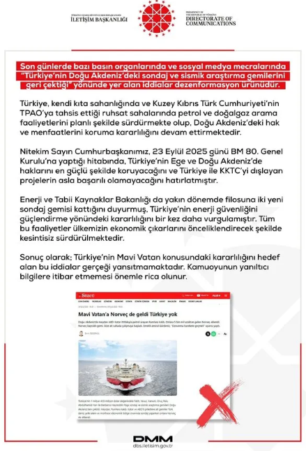 "Nitekim Sayın Cumhurbaşkanımız, 23 Eylül 2025 günü BM 80. Genel Kurulu'na yaptığı hitabında, Türkiye'nin Ege ve Doğu Akdeniz'de haklarını en güçlü şekilde koruyacağını ve Türkiye ile KKTC'yi dışlayan projelerin asla başarılı olamayacağını hatırlatmıştır. Enerji ve Tabii Kaynaklar Bakanlığı da yakın dönemde filosuna iki yeni sondaj gemisi kattığını duyurmuş, Türkiye'nin enerji güvenliğini güçlendirme yönündeki kararlılığını bir kez daha vurgulamıştır. Tüm bu faaliyetler ülkemizin ekonomik çıkarlarını önceliklendirecek şekilde kesintisiz sürdürülmektedir. Sonuç olarak Türkiye'nin 'Mavi Vatan' konusundaki kararlılığını hedef alan bu iddialar gerçeği yansıtmamaktadır. Kamuoyunun yanıltıcı bilgilere itibar etmemesi önemle rica olunur."