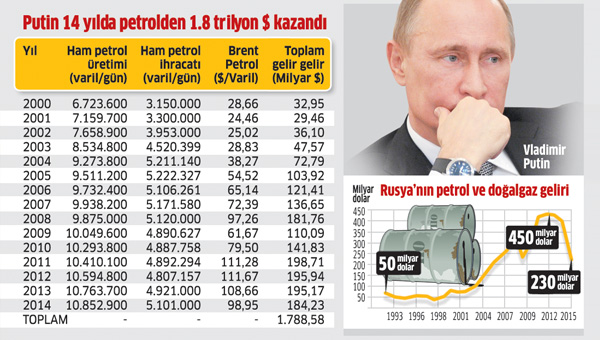 Putin’in gerginliği tırmandırmasının perde arkasında petrol fiyatlarındaki düşüş olduğu belirtiliyor. Petrol ve doğalgaz gelirleri 450 milyar dolardan 230 milyar dolara düşen Putin, Ortadoğu’daki hatların Akdeniz’e bağlanmasını engellemeye çalışarak, ülkesini de krizden çıkarmaya çalışıyor.