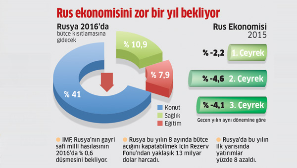 Petrol fiyatlarındaki düşüş, Batılı ülkelerin yaptırımları ve ülkeye giren sermaye akışındaki durgunluk nedeniyle zor günler geçiren Rus ekonomisi için 2016’nın da negatif yönlü baskılarla geçmesi bekleniyor. 2015 ilk çeyrekte yüzde 2.2 daralan Rus ekonomisi, 2. çeyrekte yüzde 4.6, 3. çeyrekte ise geçen yılın aynı dönemine göre yüzde 4.1 küçüldü. Gelecek yıl Rus ekonomisini nelerin beklediğine dair değerlendirme yapan Rus Dışişleri Bakanlığına bağlı Moskova Devlet Üniversitesi Dünya Ekonomisi Bölümü Başkanı Prof. Dr. Aleksandr Bulatov, 2016’nın Rusya ekonomisi için parlak bir yıl olmayacağını belirtti. Bulatov, gerek Rus yetkililerin gerekse de IMF’nin, gelecek yıl petrol fiyatlarının varil başına 50 dolar civarında seyredeceği öngörüsüne dikkati çekerek, “Bu nedenle Rusya, gayri safi milli hasılasının 2016’da sadece 0.7 artmasını, IMF ise daha kötümser bir tahminle yüzde 0.6 düşmesini bekliyor” dedi.