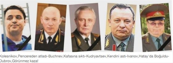 Trenin altına 'düştü' Rus askeri istihbaratının iki numarası Tuğgeneral Ivanov'un cesedi, 16 Ağustos 2010'da Türkiye'nin Hatay sahillerinde kıyıya vurdu. Rusya, Suriye'nin Tartus Limanı'nda deniz üssü kurarken General Ivanov ise en son bu üssün inşasını teftiş ederken görülmüştü. Ivanov, yurt dışında yaşayan Çeçenlerin cinayet serisini organize eden bir asker olarak da biliniyor. Putin döneminde hayatını kaybeden generallerden bazıları da ilginç cinayetlere kurban gitti. Tuğgeneral Şevelöv 2002'de arabada yakılarak, Korgeneral Trofimov 2005'te silahla vurularak, Korg. Troşev 2005'te uçak kazasıyla, Tuğg. Petrov 2009'da zehirlenerek, Tümg. Dubrov 2010'da elektrikli trenin altına 'düşerek' öldü. Orgeneral Graçöv ise 2012'de zehirlenme tanısıyla yaşamını yitirdi.