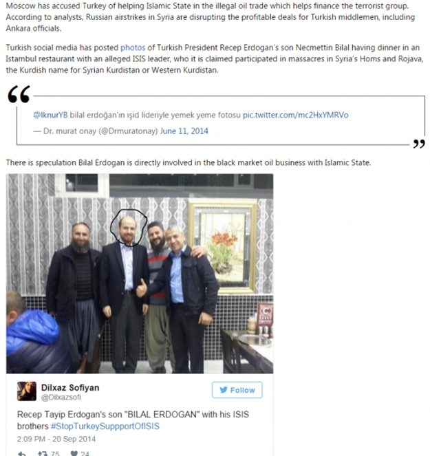 "Ankara'nın IŞİD'le petrol ticareti" başlıklı haberin içeriğinde Cumhurbaşkanı Erdoğan'ın oğlu Bilal Erdoğan'ın sakallı 2 kişiyle çekilmiş bir fotoğrafı yayınlandı. Erdoğan'ı IŞİD'le petrol ticareti yapmakla itham eden Russia Today, Bilal Erdoğan'ın fotoğrafını da belge olarak verdi.