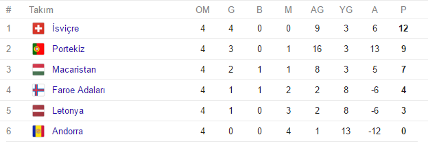 Portekiz Milli Takımı B Grubu'nda topladığı 9 puanla lider İsviçre'nin 3 puan gerisinde 2. sırada yer alıyor.