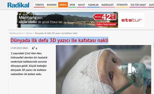 Yalan yayınları ile bilinen Pornocu Aydın Doğan Medyası bir kez daha yalana sarıldı. Okuyucuyu aldatma yolunda kimseden çekinmeyen Doğan'ın Radikal adlı internet sitesi, 'Dünyada ilk defa 3D yazıcı ile kafatası nakli' başlığıyla bir haber yayınladı. Naklin ilk defa Çin'de yapıldığını iddia eden söz konusu sitenin yalanı çok geçmeden ortaya çıktı.